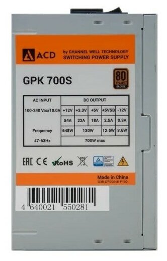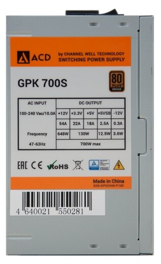 Блок питания ACD GPK700S 700W, 80+ Bronze (GPK-700S) 6 135 ₽ Подробнее