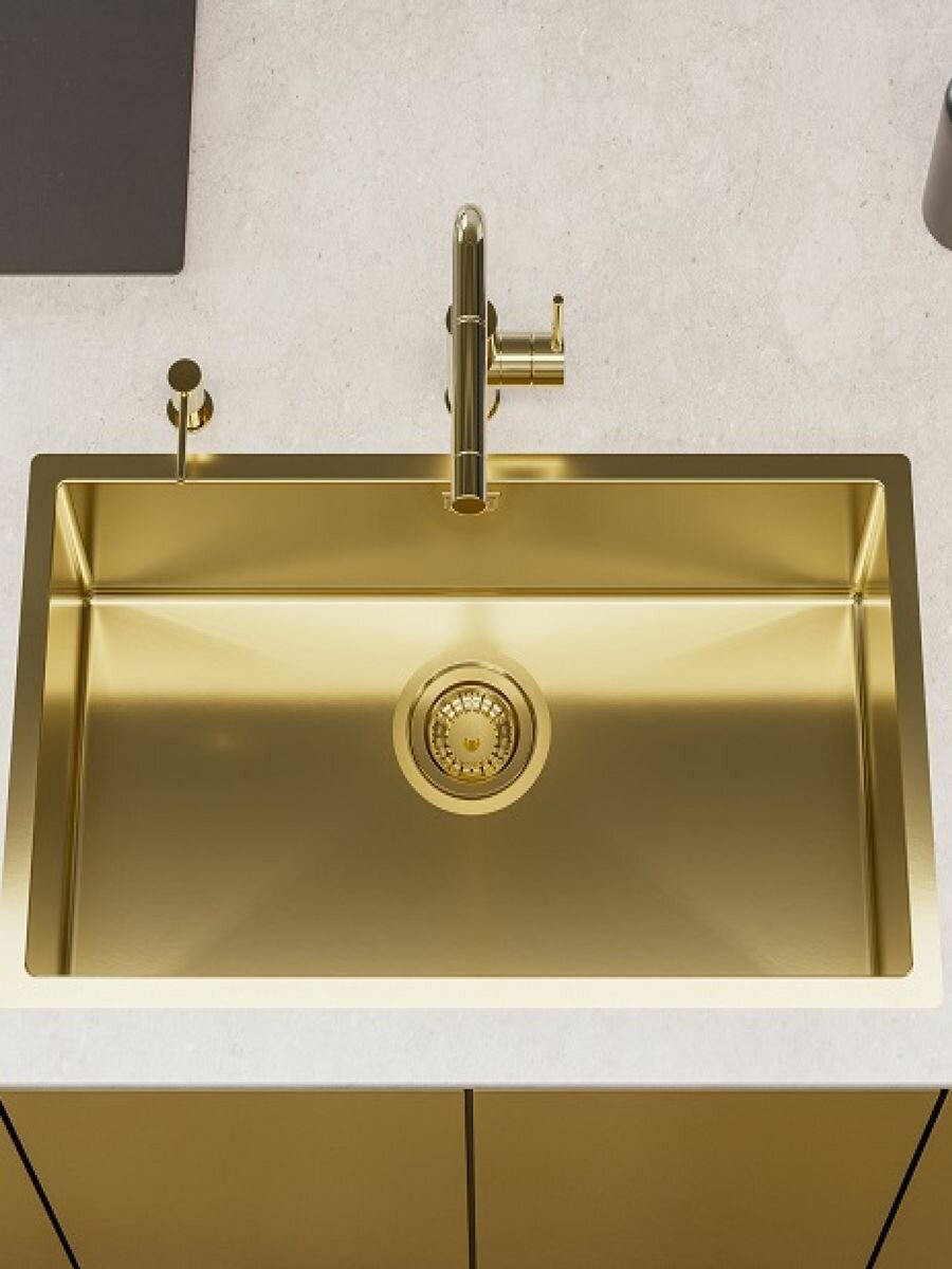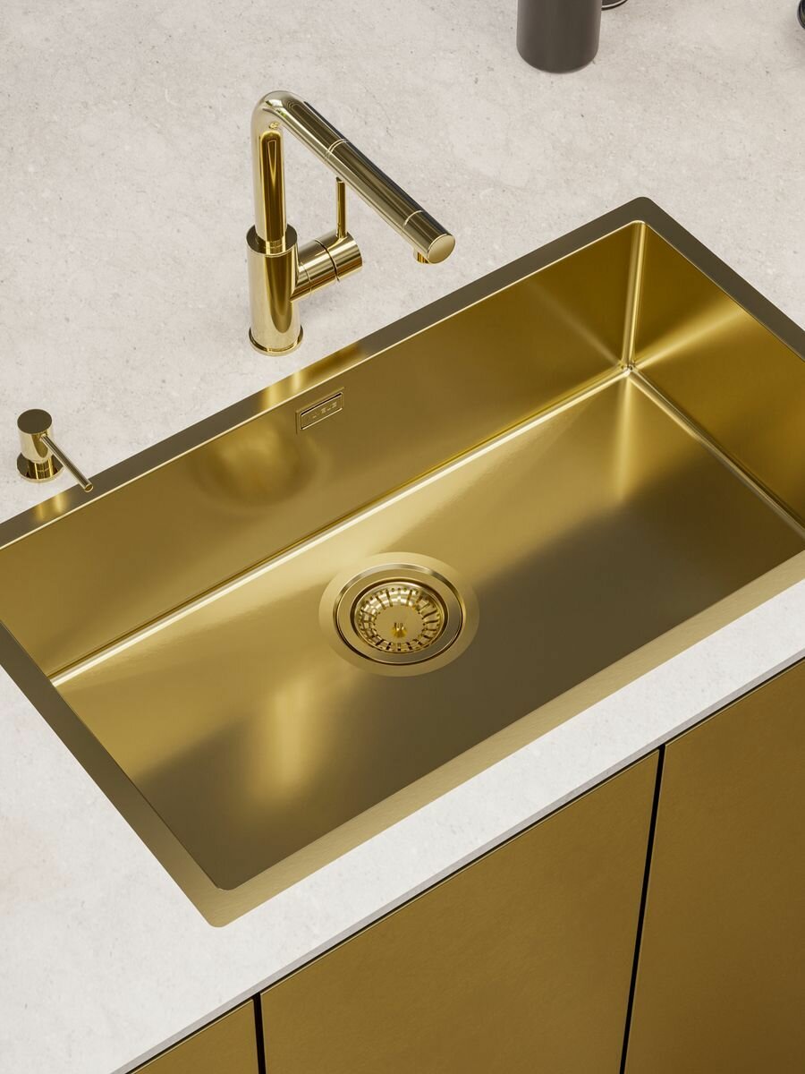 Смеситель для кухни с PVD покрытием с высоким, выдвижным, поворотным изливом ALVEUS ZEOS P MONARCH GOLD золотой