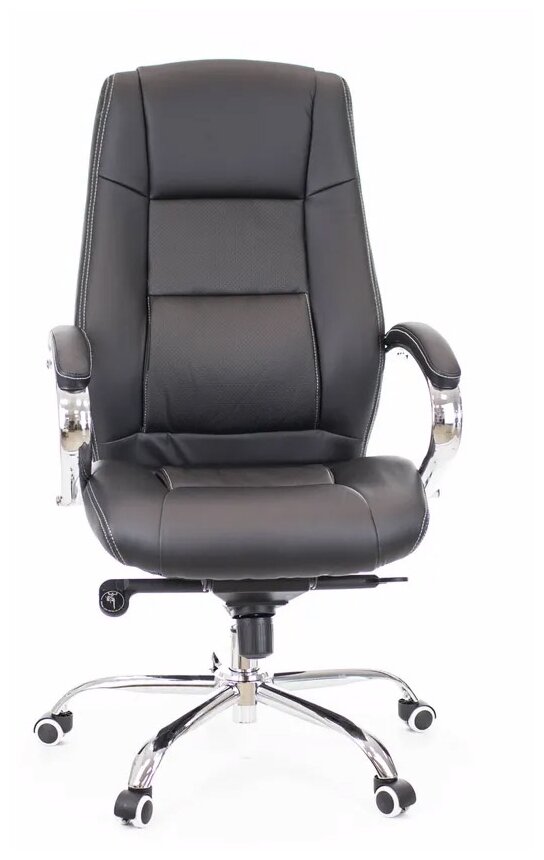 Лучшие цены. Кресло для руководителя Kron M с обивкой из черной экокожи и хромированным каркасом оснащено высокой спинкой с подголовником и поясничным упором. Для комфорта пользователя на подлокотниках есть мягкие накладки. Установлен механизм качания мультиблок. Конструкция предназначена для нагрузки до 120 кг. Колеса кресла не оставят повреждений при движении по ламинату или паркету. Магазины в вашем городе.