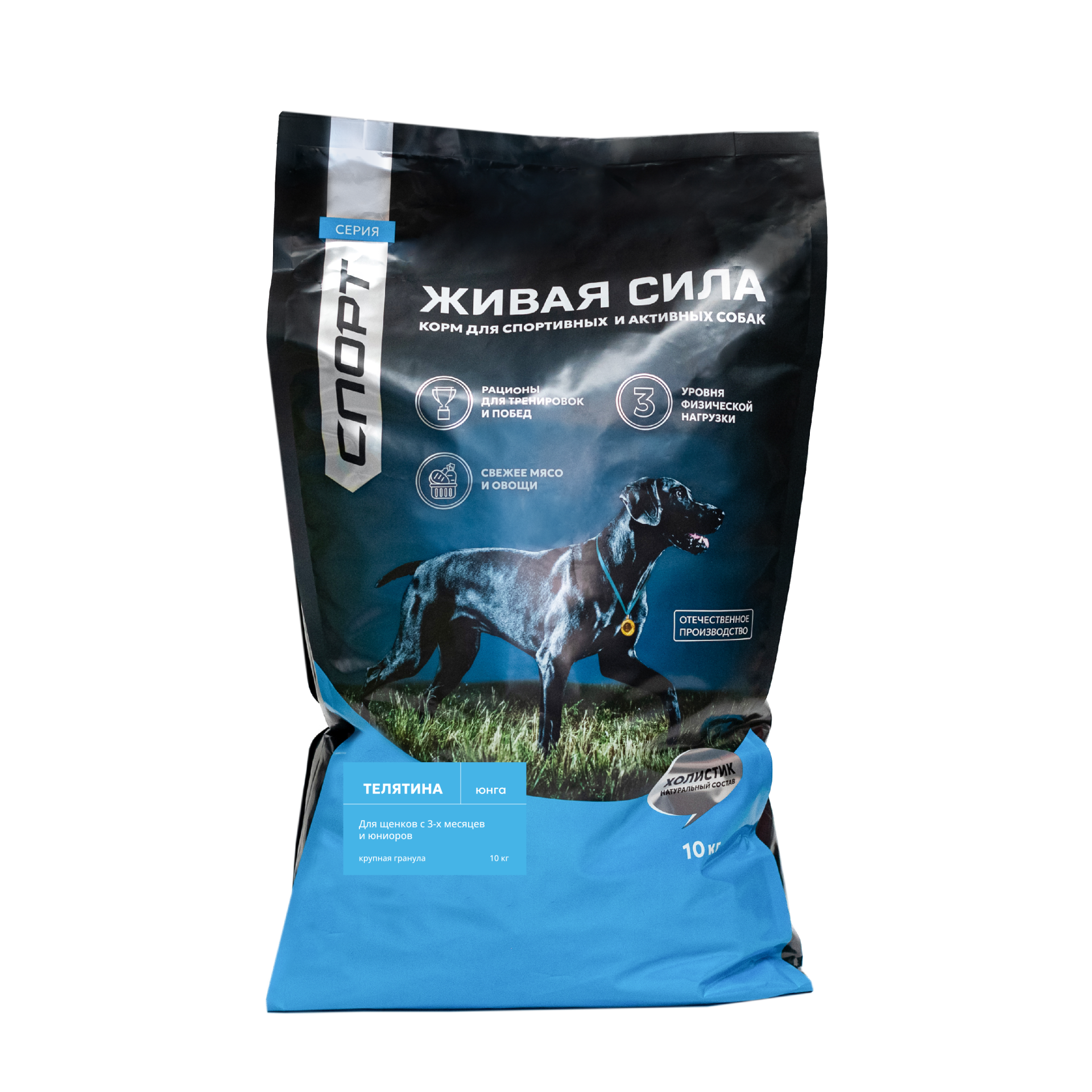 Живая сила Спорт, Юнга корм для щенков всех пород от 3 месяцев с телятиной и рыбой, Крупная гранула (10 кг)