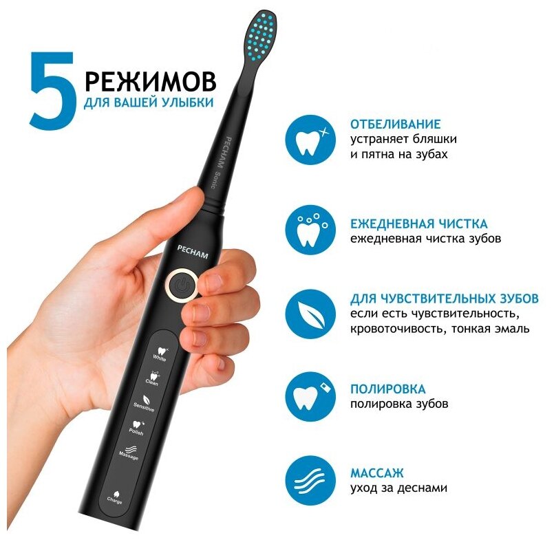 Электрическая зубная щетка PECHAM Sonic White, 3 насадки, Дорожный кейс, 5 режимов чистки
