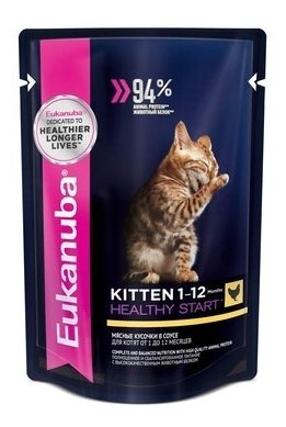 Влажный корм для котят Eukanuba Kitten Healthy Start, для здоровья кожи и блеска шерсти, c курицей, 85 г (кусочки в соусе) 130 ₽ Подробнее