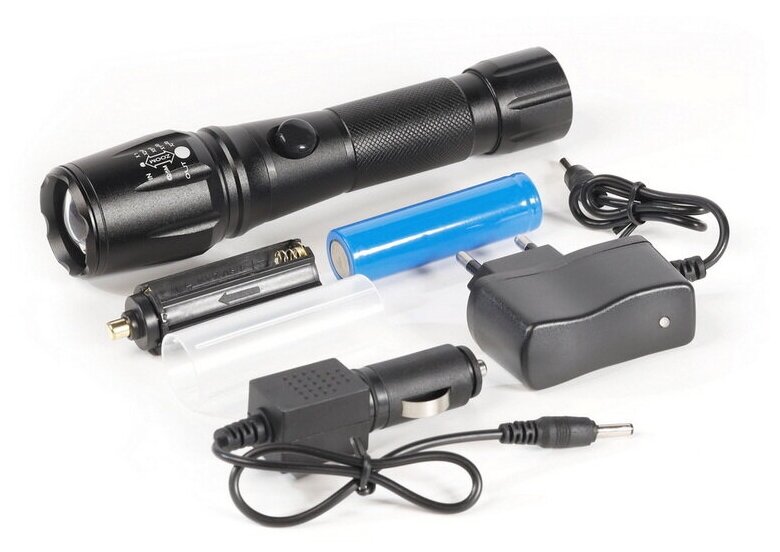 Лучшие цены. Мощный светодиод CREE XM-L T6. Три режима работы: дальний свет, ближний свет, стробоскоп. Корпус из анодированного алюминия не подвержен коррозии. Коллиматорная линза, система фокусировки луча. Тип элементов питания 2x18650 Li-ion 4В, 4800 мАч. Аккумуляторы, зарядное устройство, зарядное устройство от прикуривателя а/м в комплекте. У аккумулятора отсутствует эффект памяти, саморазряд менее 20% за год. Удобный ремешок для фиксации фонаря на запястье. Время зарядки 4 ч. Магазины в вашем городе.