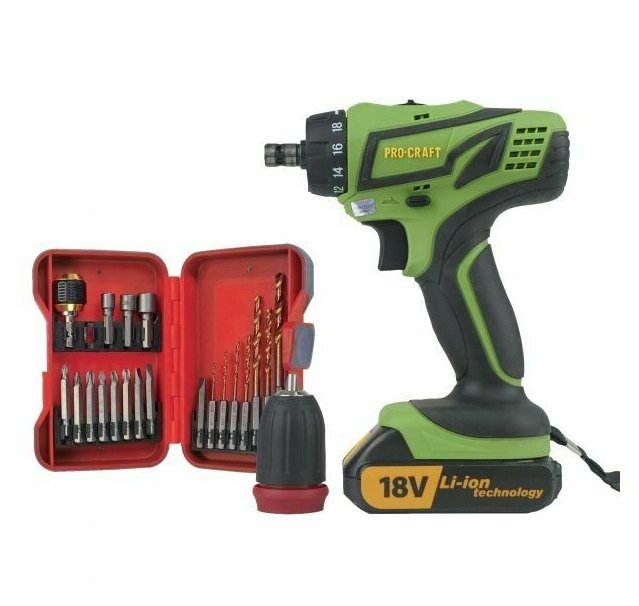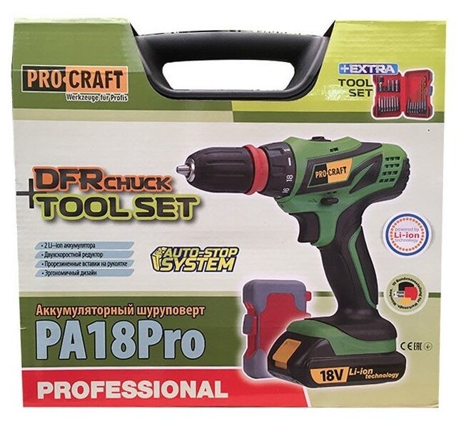 Лучшие цены. Универсальный шуруповерт ProCraft PA18PRO с DFR патроном SET и с набором инструментов имеет широкий спектр применения: гипсокартон, пластик, металл, древесина. Дополнительным плюсом шуруповерта ProCraft PA18PRO с DFR патроном SET является набор инструментов, идущий в комплекте. Легкий корпус с удобной рукояткой позволяет долго работать с шуруповертом. Благодаря быстрозажимному патрону есть возможность закончить вкручивание шурупа после остановки двигателя. Магазины в вашем городе.