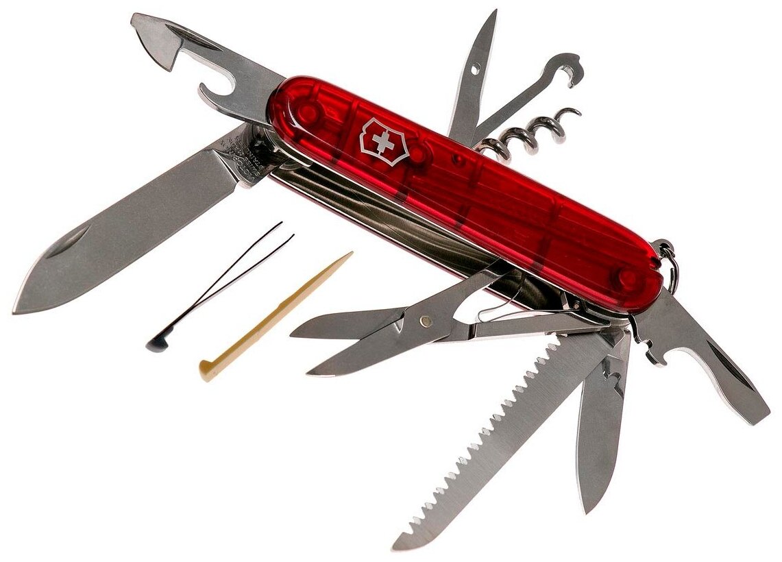 Лучшие цены. Швейцарский армейский нож HUNTSMAN имеет 15 функций: 1. Большое лезвие 2. Малое лезвие 3. Штопор 4. Консервный нож с: 5. – Малой отвёрткой 6. Открывалка для бутылок с: 7. – Отвёрткой 8. – Инструментом для снятия изоляции 9. Шило, кернер 10. Кольцо для ключей 11. Пинцет 12. Зубочистка 13. Ножницы 14. Многофункциональный крючок 15. Пила по дереву Цвет рукояти: полупрозрачный красный Рекомендуемые чехлы: 4.0480.1, 4.0480.3, 4.0520.1, 4.0520.3, 4.0520.31, 4.0520.32, 4.0543.3, 4.0533, 4.0738 Рекомендуемые. Магазины в вашем городе.