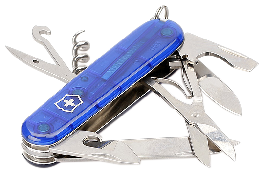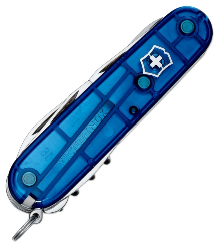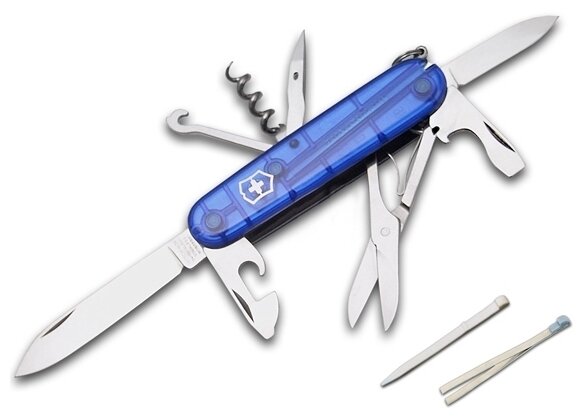 Лучшие цены. Швейцарский армейский нож CLIMBER имеет 14 функций: 1. Большое лезвие 2. Малое лезвие 3. Штопор 4. Консервный нож с: 5. – Малой отвёрткой 6. Открывалка для бутылок с: 7. – Отвёрткой 8. – Инструментом для снятия изоляции 9. Шило, кернер 10. Кольцо для ключей 11. Пинцет 12. Зубочистка 13. Ножницы 14. Многофункциональный крючок Цвет рукояти: полупрозрачный синий Рекомендуемые чехлы: 4.0480.1, 4.0480.3, 4.0520.1, 4.0520.3, 4.0520.31, 4.0520.32, 4.0543.3, 4.0533 Рекомендуемые аксессуары: Инструмент для заточки. Магазины в вашем городе.