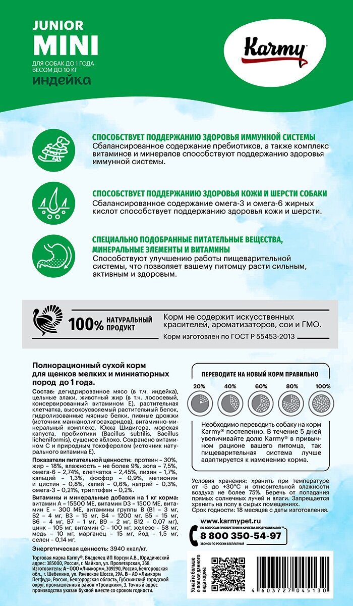 Лучшие цены. Сухой корм KARMY Mini Junior с Индейкой - полнорационный корм для щенков мелких пород до 1 года, беременных и кормящих сук. Богатый минеральными веществами, микро- и макроэлементами состав разработан с учетом индивидуальных потребностей Вашего питомца. Омега-3 и Омега-6 жирные кислоты способствуют поддержанию здоровья кожи и шерсти питомца, а комплекс пребиотиков и витаминов укрепляют его иммунную систему. Размер гранул корма максимально адаптирован для челюстей щенка. Магазины в вашем городе.