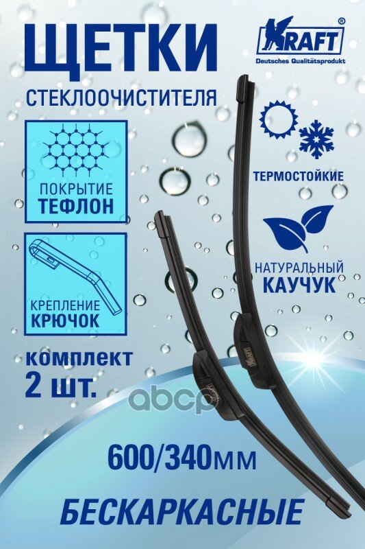 KRAFT KT830917 комплект бeскаркасных щеток стеклоочистителя teflon 600 / 340 мм, 1 адаптер