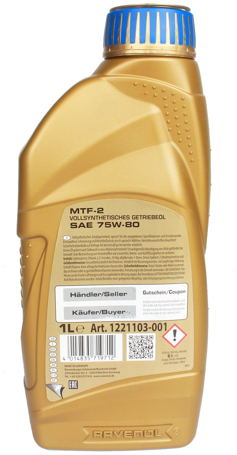 Лучшие цены. RAVENOL MTF-2 75W-80 полностью синтетическое трансмиссионное масло, изготовленное в Германии, для коробок передач на основе полиальфаолефинов PAO. Масло разработано на основе синтетического базового масла с добавлением специального комплекса присадок. RAVENOL MTF-2 75W-80 применяется при высоких механических и термических нагрузках, обеспечивает удлиненный интервал замены. Магазины в вашем городе.