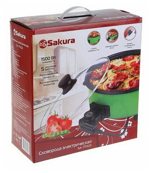 Лучшие цены. Электросковорода Sakura 1500 Вт 32 см SA-7711GR Сковорода электрическая Мощность: 1500 Вт Размер: (внешний/внутренний) Ø32 см / Ø30 см Глубина: 5 см Тип управления: механический Регулируемый термостат: есть Максимальная температура: 240ºС Материал корпуса: алюминий Толщина корпуса: 1.3 мм Покрытие корпуса: антипригарное Материал крышки: закалённое стекло Кабель питания: съемный, прорезиненный, 1 м. Магазины в вашем городе.