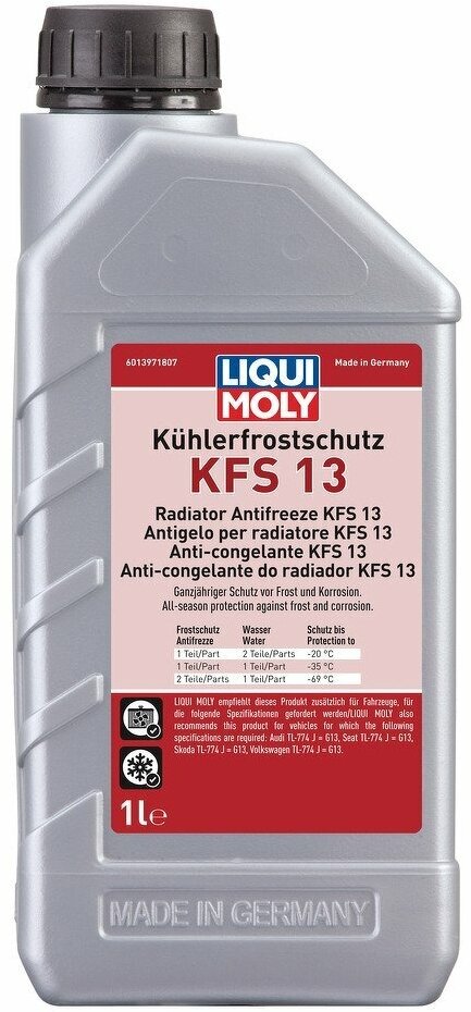 Лучшие цены. Антифриз-концентрат KUHLERFROSTSCHUTZ KFS 13 1л LIQUI MOLY 21139 Для всех систем охлаждения и двигателей, в особенности высоконагруженных алюминиевых двигателей легковых и грузовых автомобилей, автобусов, с/х техники и стационарных двигателей. Для максимальных интервалов замены. Соответствует требованиям VAG G13 (TL-774 J). Особенности: Kuhlerfrostschutz KFS 13 - антифриз на основе этиленгликоля и гибридных технологий, соответствующий классу G13. Магазины в вашем городе.