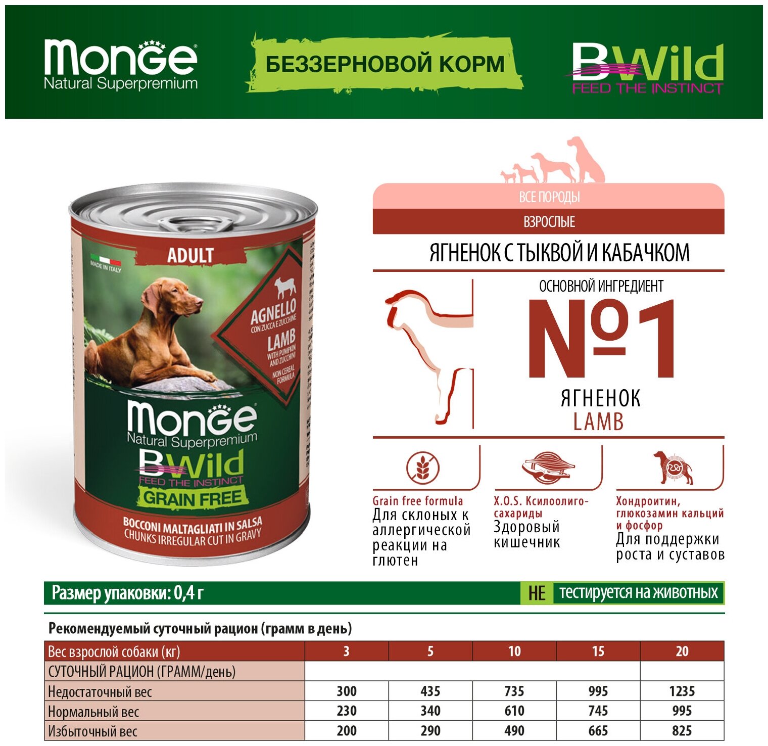 Корм для собак Monge BWild GRAIN FREE беззерновые консервы из ягненка с тыквой и кабачками для взрослых собак всех пород 400 г