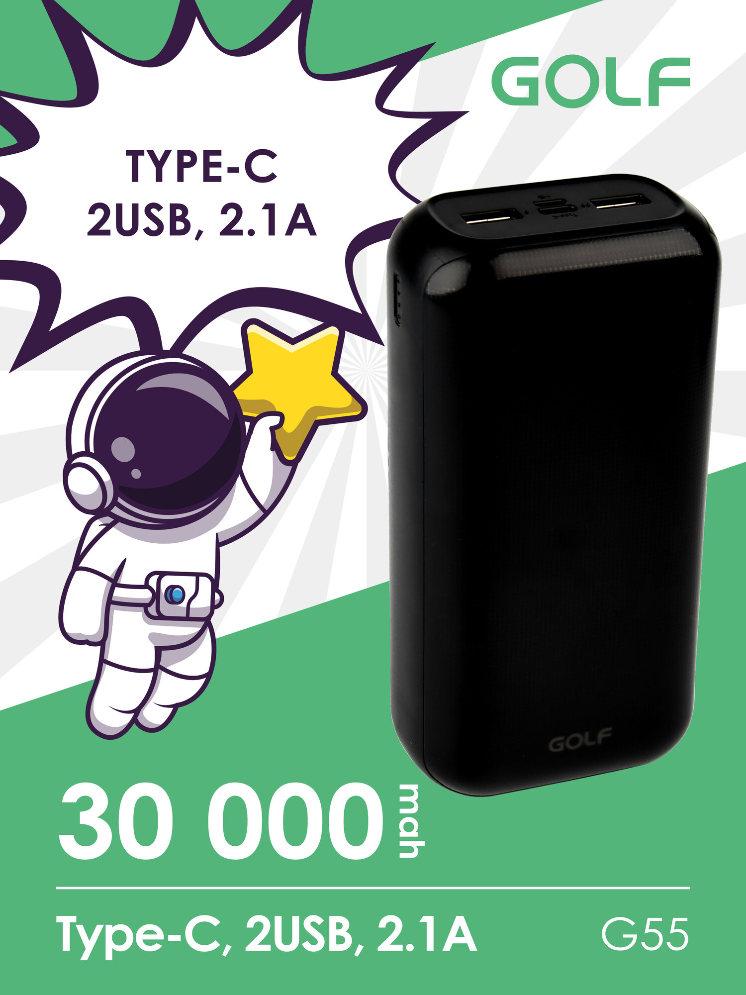 Внешний аккумулятор 30000mAh GOLF G55-C Powerbank, Micro usb/In Micro usb, Type-C/Out Type-C 2.1A, USB 1 А, 2.1A/ черный электротовар