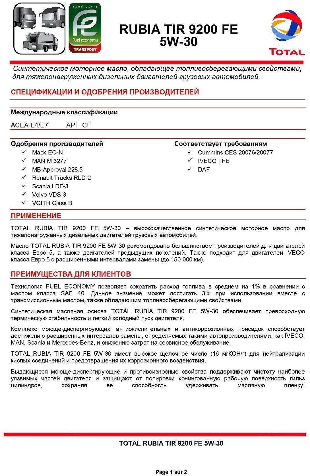 Моторное масло Total1 TOTAL Моторное масло для дизелей (тяжелая техника) TOTAL RUBIA TIR 9200 FE 5W30 5L 213668