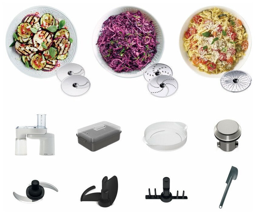 | Аксессуары | венчик для взбивания / насадка / крюк для замеса теста / нож для измельчителя / 5 насадки для нарезки/шинковки |