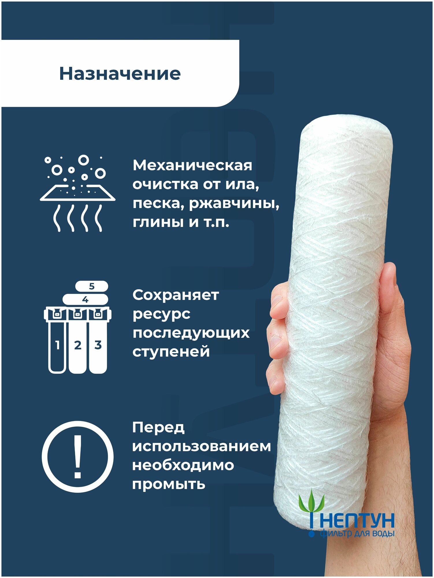 Картридж нитяной “Нептун” PS-10SL 1мкм (Комплект 3 шт). Грубая очистка воды от: ила, песка, глины, мусора, ржавчины, окалины, известняка, нерастворенного металла, фрагментов органики и т.п.