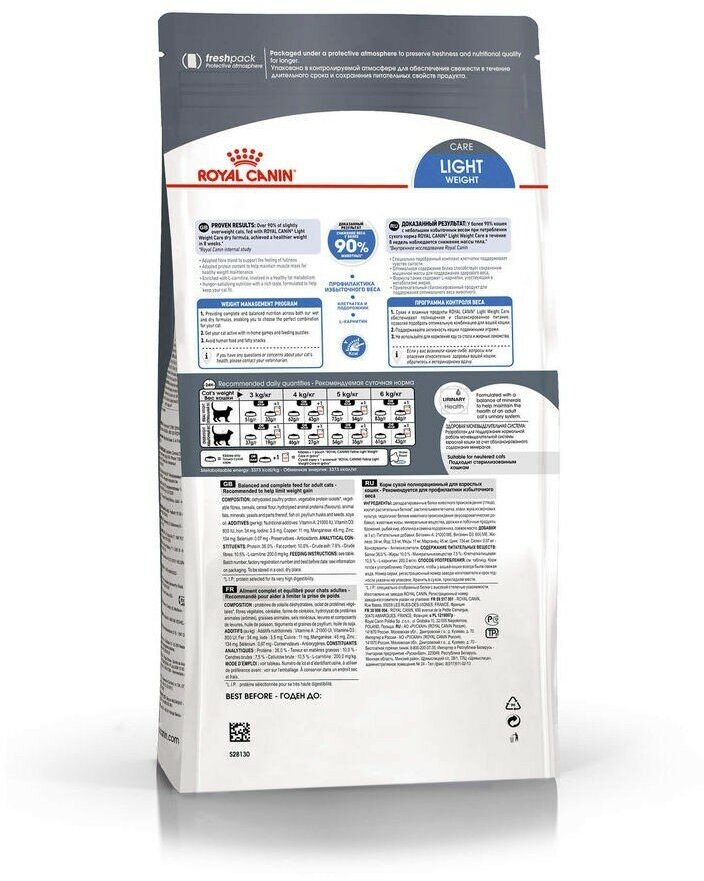 Лучшие цены. Оптимальные физическая кондиция и мышечная масса – факторы, во многом определяющие состояние здоровья кошек. Точно сбалансированная формула ROYAL CANIN® Light Weight Care поможет поддерживать оптимальный вес животного. Продукт содержит специально разработанный комплекс различных видов клетчатки, в том числе семя подорожника, увеличивающий объем корма в желудке, надолго обеспечивающий чувство сытости и за счет этого снижающий спонтанное потребление корма. Магазины в вашем городе.