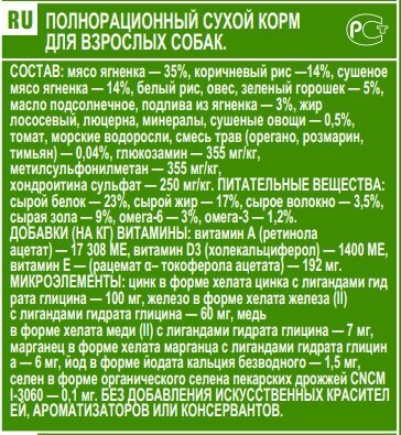 | Ингредиенты | баранина, бульон, картофель, шпинат, кабачок, горох, масло, водоросли |