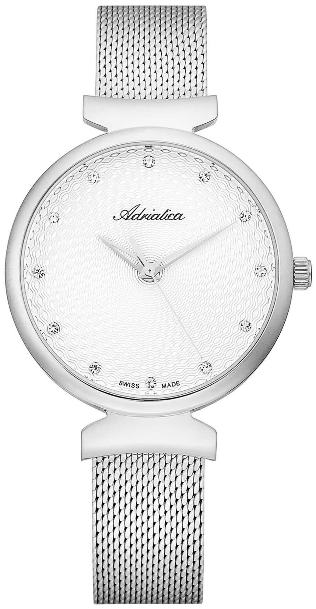 Лучшие цены. Женские кварцевые часы. Калибр механизма ETA 902. Центральные часовая, минутная и секундная стрелки. Белый циферблат украшен кристаллами в местах часовых меток. Круглый корпус выполнен из полированной нержавеющей стали. Диаметр корпуса составляет 34 мм, толщина 7 мм. Стальной браслет выполнен в технике миланского плетения, раскладная застежка. Прочное минеральное стекло устойчивое к мелким механическим повреждениям. Водостойкость WR 30 (брызги). Магазины в вашем городе.