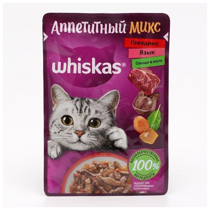 Влажный корм Whiskas"Аппетитный Микс" для кошек с говядиной, языком и овощами в желе, 75 г х 28 шт