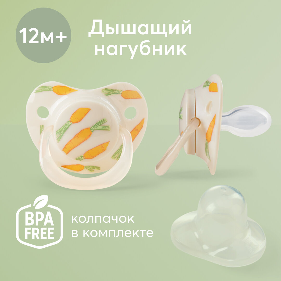 Соски и пустышки 13008/1, Соска-пустышка 12-24м Happy Baby, силикон, капля с колпачком, бежевая с морковками