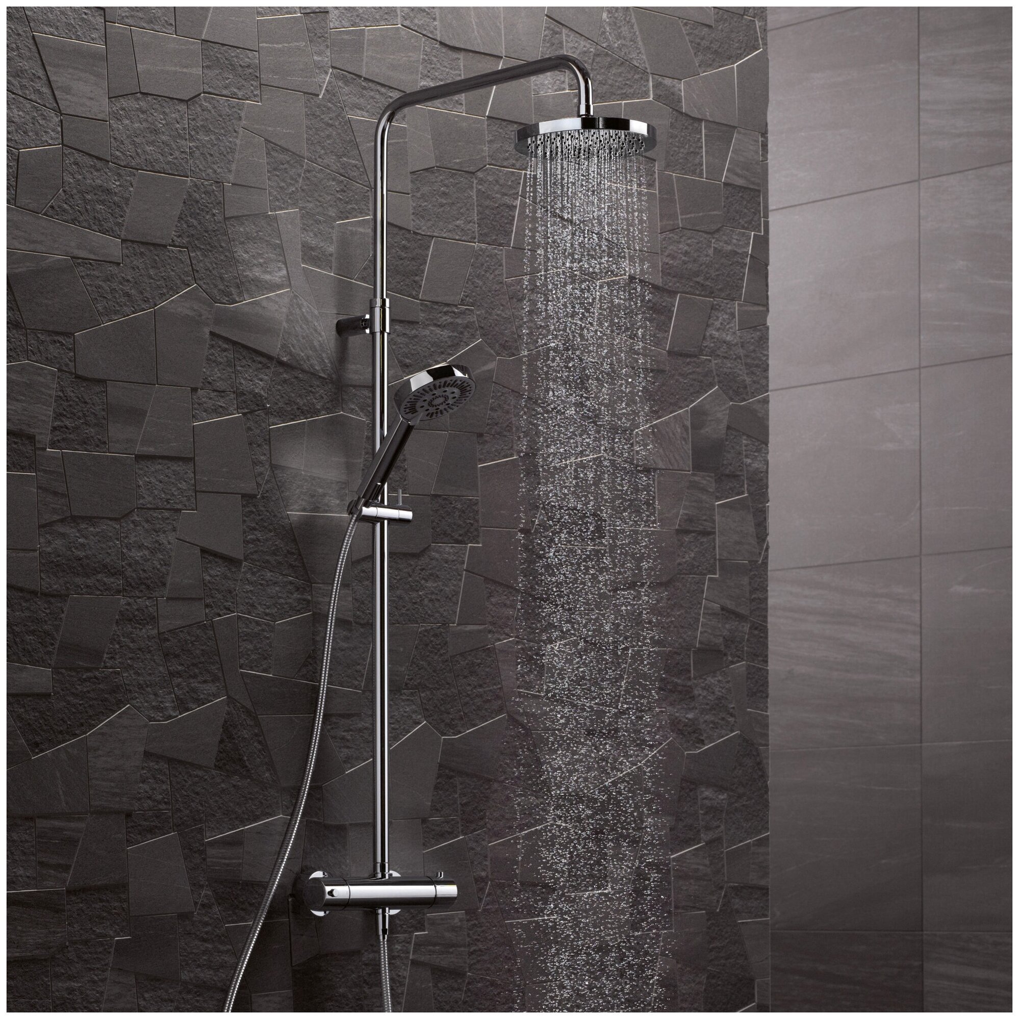 | Комплектация | ручной душ (душевая лейка) / верхний душ (тропический) / смеситель / стойка / штанга / душевой шланг / крепление ручного душа |