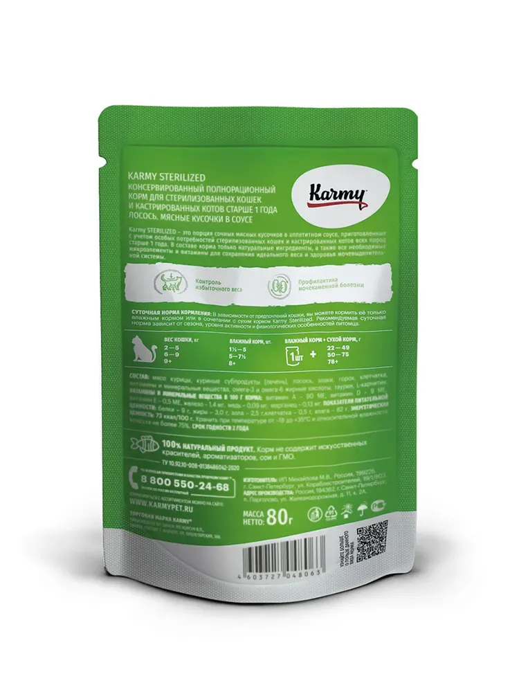 Влажный для стерилизованных кошек Karmy Sterilized, лосось 80 г (кусочки в соусе)