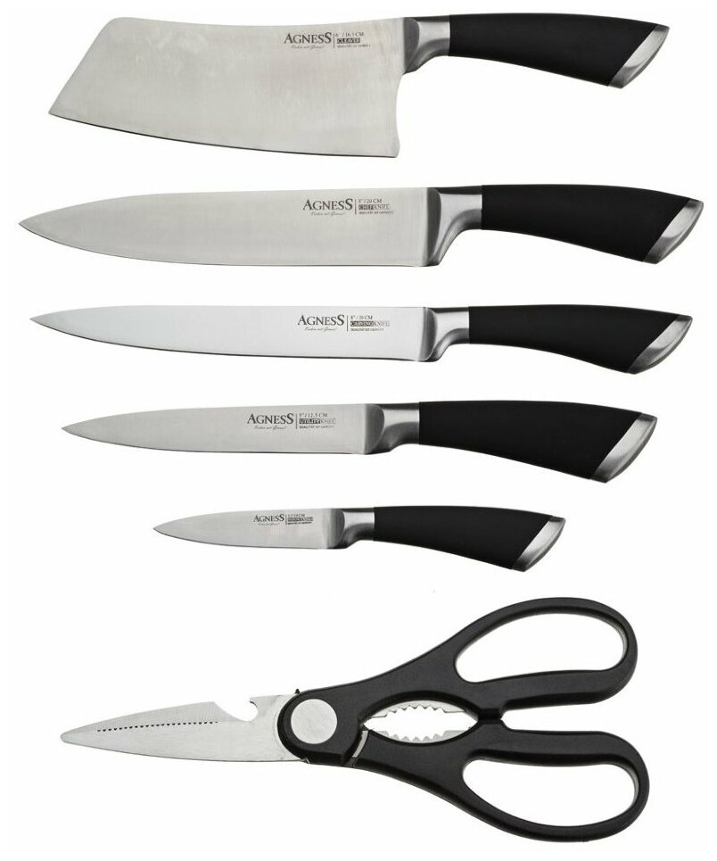 Лучшие цены. Набор ножей Agness с силиконовыми ручками на пластиковой подставке 8 пр. Нож - главный инструмент на кухне, а вернее ножи, так как даже самый лучший нож не сможет справиться со всем многообразием задач. Выбирая набор ножей AGNESS, Вы приобретаете комплект самых необходимых и чаще всего используемых ножей. Преимущества ножей AGNESS: ● Эргономичная ручка с покрытием Soft Touch для удобной нарезки ● Лезвие из высокоуглеродистой коррозионной стали ● 2-х сторонняя заточка лезвия ● Удобная вращающаяся подставка. Магазины в вашем городе.