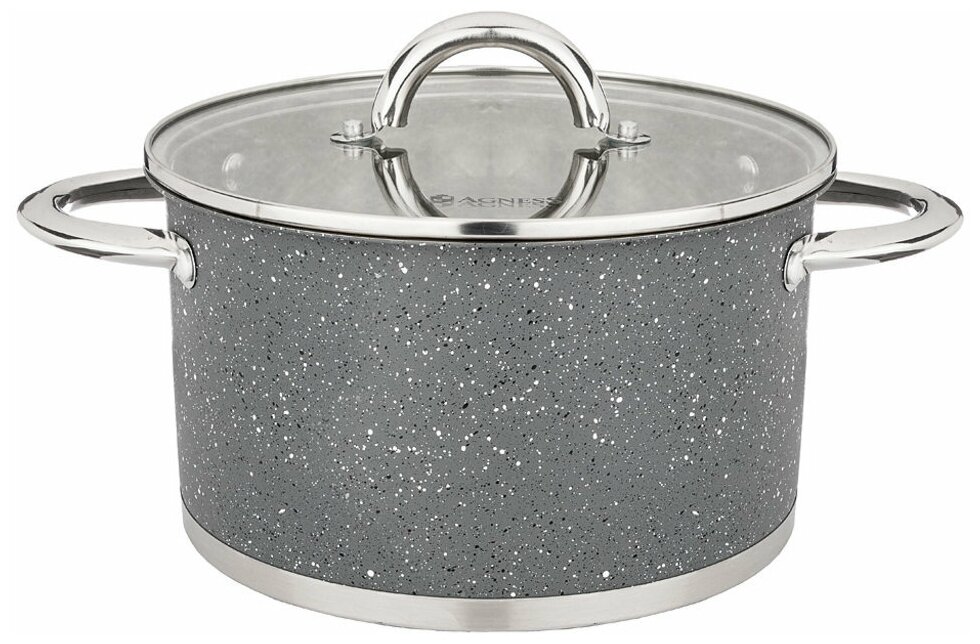 Лучшие цены. Кастрюля AGNESS со стеклянной крышкой, нерж. сталь, серия монблан 4,6Л 22Х12,5СМ Бренд AGNESS представляет кастрюли из нержавеющей стали серии Монблан. Изюминка этой серии - это внешнее жаропрочное покрытие выполненное под серый "мрамор" и обеспечивающее высокую износостойкость посуды. Энергосберегающее капсульное дно обеспечивает быстрый и равномерный нагрев посуды. Магазины в вашем городе.