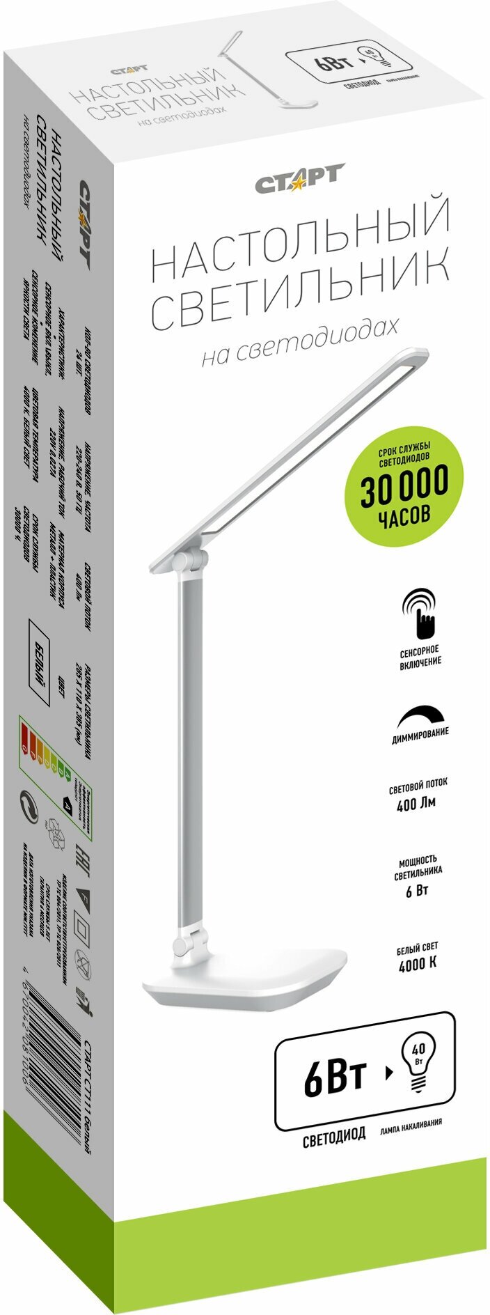 Лучшие цены. Светодиодный светильник старт СТ111 — универсальный, подходит для дома и офиса, как источник дополнительного точечного света в помещении. Он представляет собой плоский вытянутый плафон на прямой стойке и плоском основании. Плафон может подниматься и опускаться под нужным углом, стойка поворачивается. Корпус белого цвета выполнен из пластика и металла. Светильник старт СТ111, как и другая продукция российской марки старт, изготовлен на китайском заводе с соблюдением международных стандартов качества и. Магазины в вашем городе.