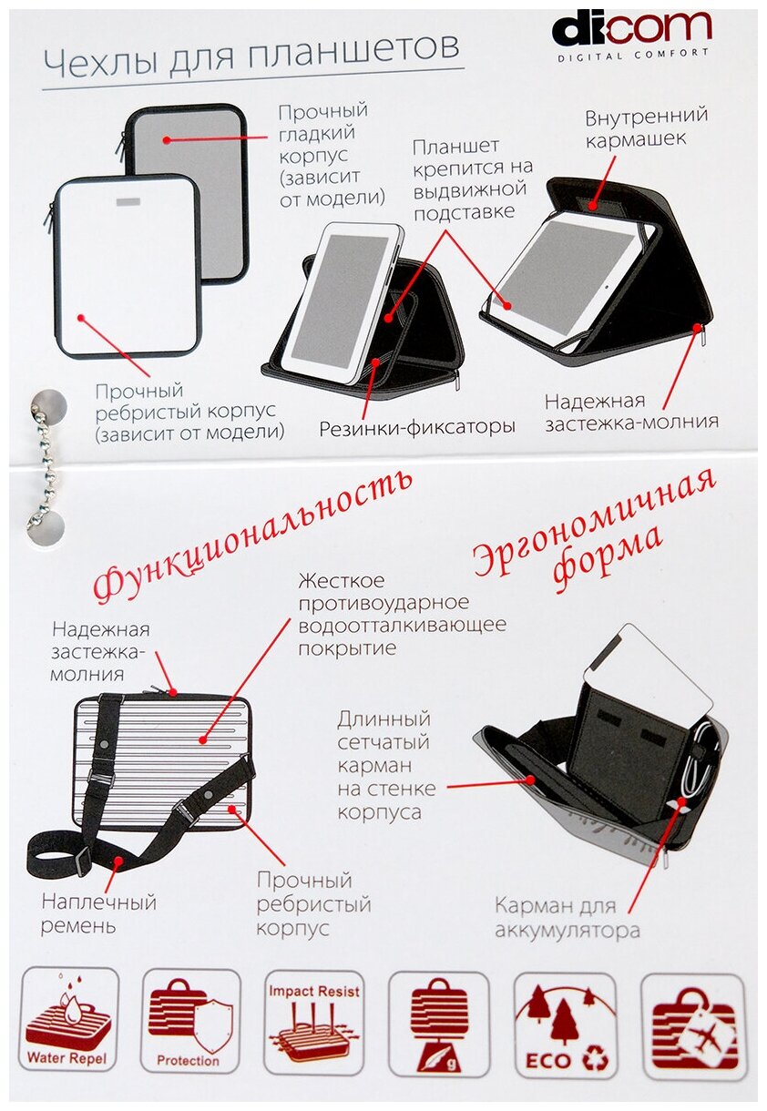 Лучшие цены. Чехол Dicom T11 mat надежно защитит ваш гаджет при повседневном использовании. Полипропилен убережет от пыли или грязи и смягчит удар при падении. Оснащен универсальными держателями. Модель придаст вашему девайсу не только привлекательности, но и сделает его удобным в повседневной работе, интернет навигации, чтении и в общении с друзьями. Эргономичный дизайнЧехол может использоваться для планшета до 11-дюйм. Магазины в вашем городе.