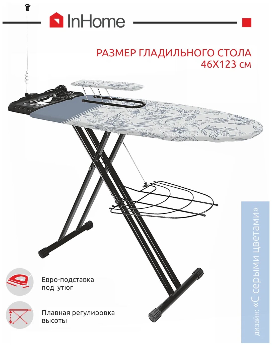 Гладильные доски Гладильная доска InHome складная с розеткой и подставкой для утюга/парогенератора INHSK/4, 123х46 см, с серыми цветами
