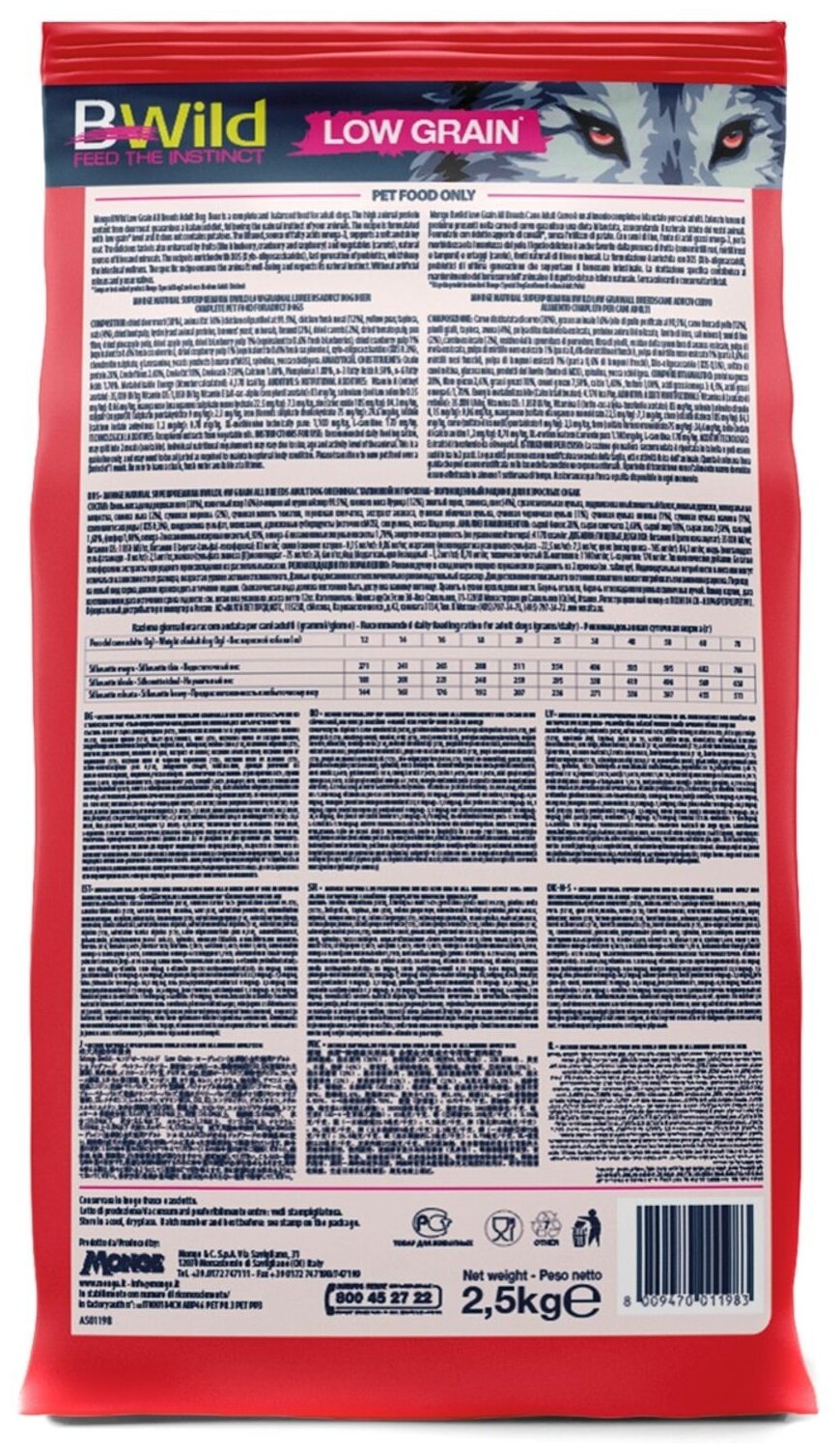 Лучшие цены. Monge Dog BWild LOW GRAIN низкозерновой корм из мяса оленя для взрослых собак всех пород - полноценный сбалансированный рацион из мяса оленя для взрослых собак всех пород. Рацион разработан с высоким содержанием белка и с ограниченным количеством злаков, и не содержит картофеля. Оптимальный баланс Омега-3 и Омега-6 в составе корма чрезвычайно важен для поддержания красоты шерсти и здоровья кожи. Лесные ягоды и травы - источники питательных веществ, натуральной клетчатки и биологически активных компонентов. Магазины в вашем городе.