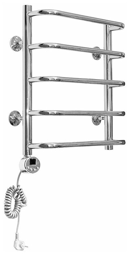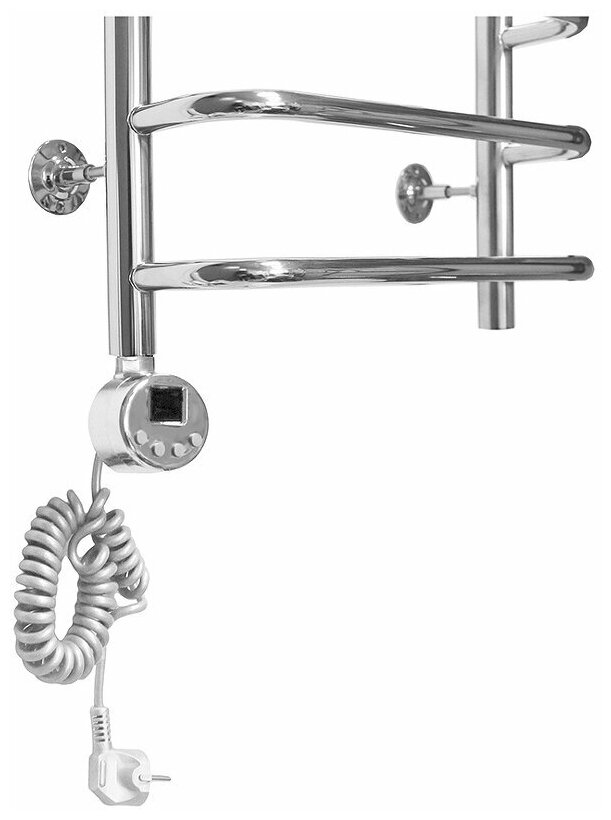 Лучшие цены. Электрический полотенцесушитель из пищевой нержавеющей стали. Цвет «хром» – полированная до зеркального блеска нержавеющая сталь. Труба электросварная. Толщина 2 мм. Вертикальные стойки имеют диаметр 32мм, горизонтальные перекладины выполнены из трубы диаметром 18мм. ТЭН имеет цифровой терморегулятор, температура регулируется от 35 до 70 градусов. Встроен таймер автоотключения на 2 и 4 часа. ТЭН оснащён двумя термодатчиками, которые защищают устройство от перегрева. Возможно скрытое подключение. Магазины в вашем городе.