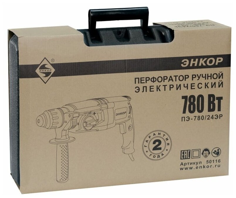 Лучшие цены. Перфоратор ПЭ-780/24ЭР энкор имеет мощность всего 780 Вт, что не мешает производить высокоэффективную работу. В наличии перфоратора три режима работы. Максимальный диаметр отверстий в твердых породах — 24 мм, в более мягких — до 65 мм. Вид патрона используется sds-plus. Довольно небольшой вес инструмента в 3000 грамм обеспечивает максимально комфортную работу. Перфоратор ПЭ-780предоставляется в упаковке-кейсе. Также на перфоратор предоставляется гарантийное обслуживание на 24 месяца. Магазины в вашем городе.