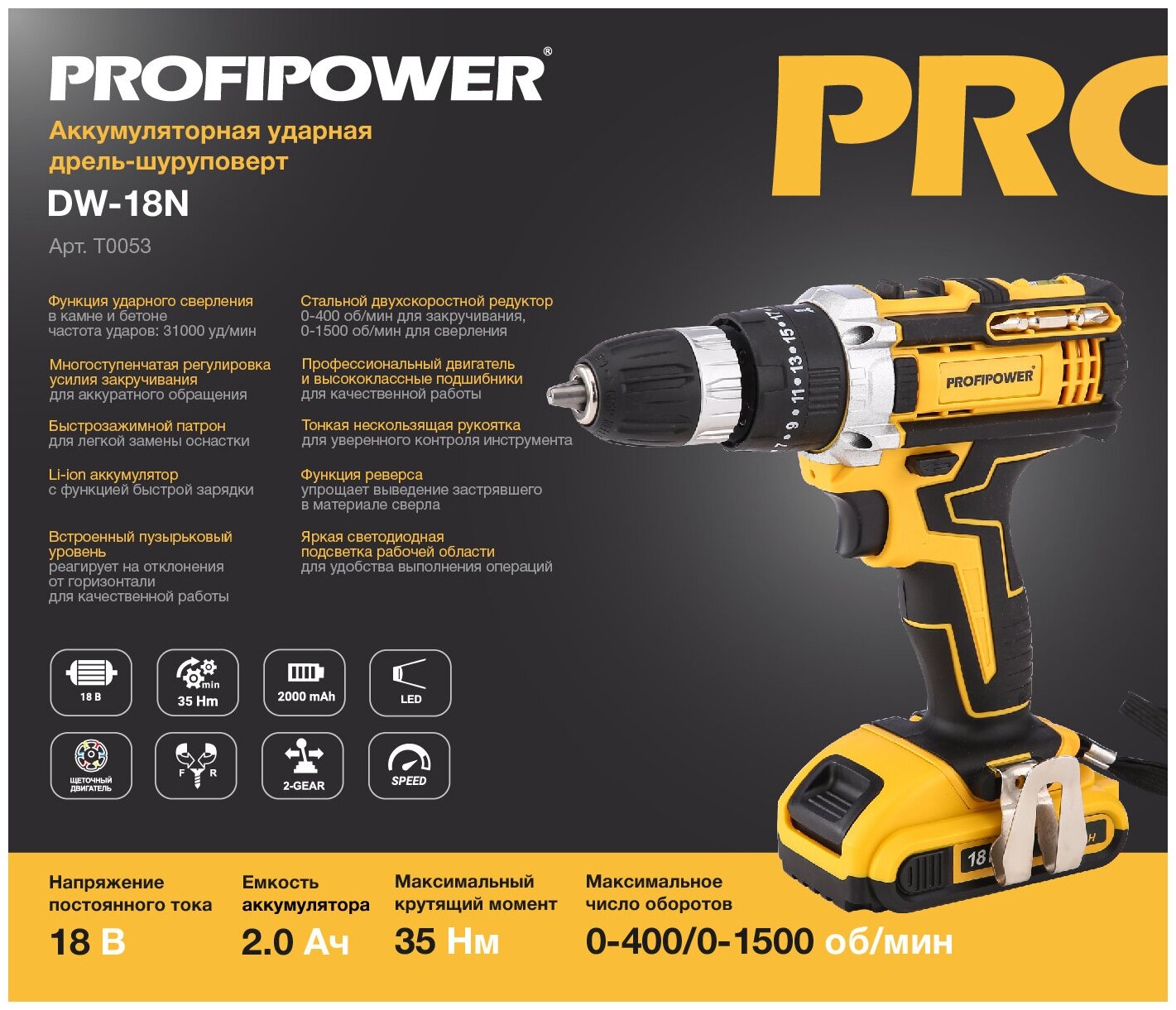 Дрели и шуруповерты Шуруповерт акк. DW-18N ударный 18В, Li-ion-2шт, 2.0Ач, 35Нм, 2 скорости, З/У, кейс ProfiPower
