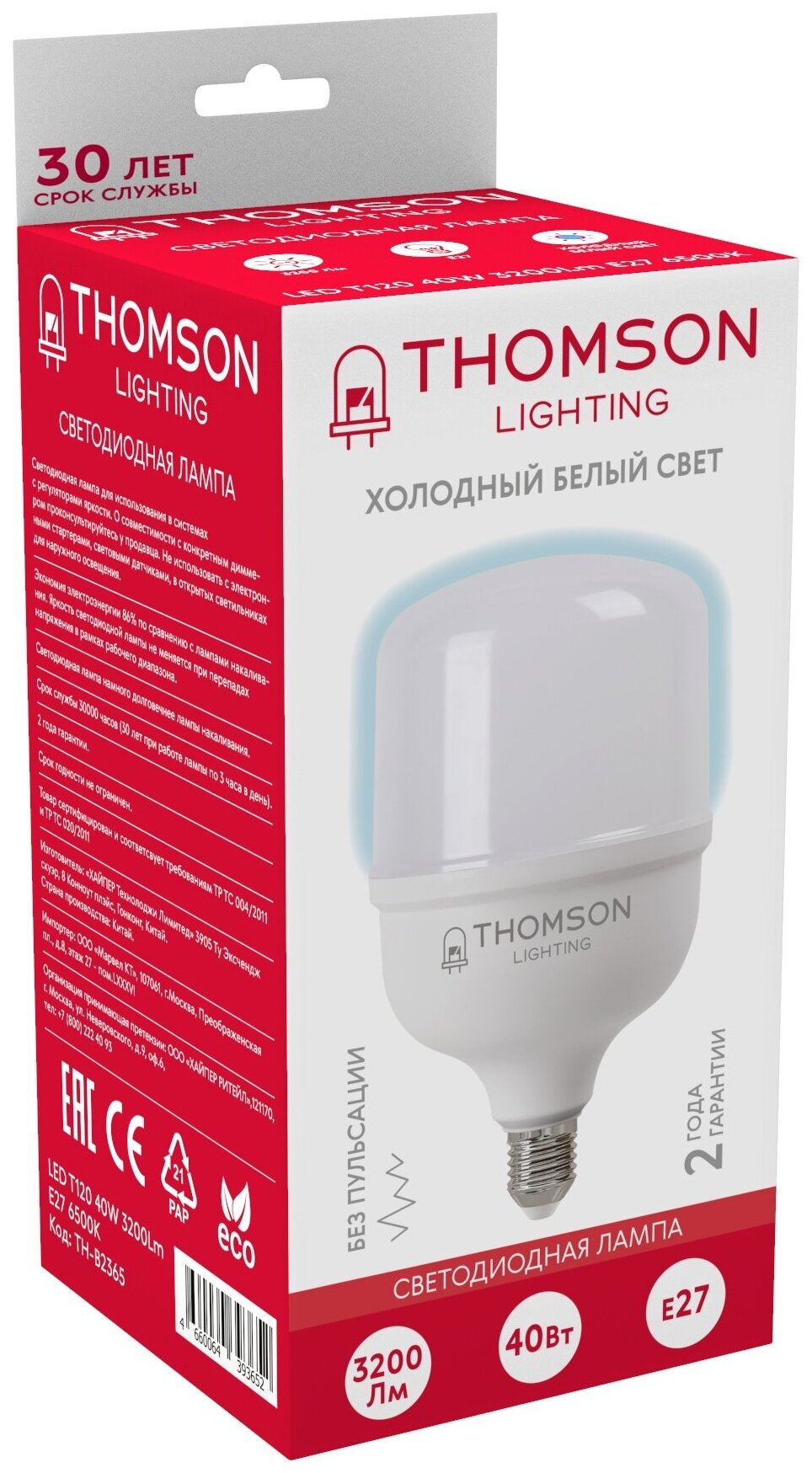 Лучшие цены. Лампа светодиодная Thomson E27 40W 6500K цилиндр матовая TH-B2365 в форме цилиндра от производителя Thomson из Франции размером 166 мм. по высоте, диаметром 120 мм. с цоколем E27 и мощностью 40 W и способна осветить помещение площадью . Изделие предназначено для использования в сети 170-265 Вольт. Магазины в вашем городе.