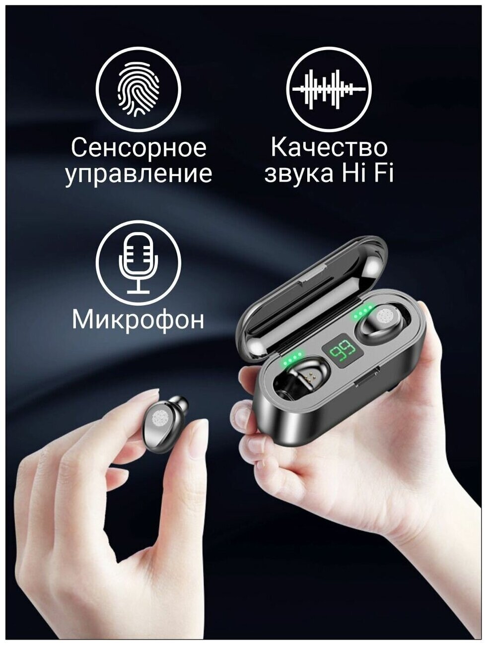 Лучшие цены. Беспроводные bluetooth наушники с сенсорным дисплеем и автоматическим подключением f9. Беспроводные наушники с микрофоном универсальны и подходят для Android и IOS с поддержкой Bluetooth. Основные функции bluetooth блютуз наушники для телефона: - Индикатор заряда кейса: Вы можете легко просмотреть состояние зарядки. - Мощный аккумулятор: воспроизведение музыки до 6 часов. Также можно использовать как power bank для смартфона. Дополнительная функция держателя телефона. Магазины в вашем городе.