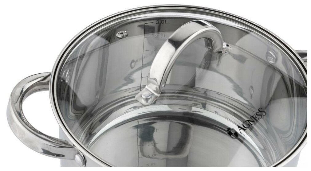 Лучшие цены. Кастрюля classic со стеклянной крышкой 3,1 л. 20x11,5 см Agness (914-222) Кастрюли AGNESS выполнены из нержавеющей стали с высокими антикоррозионными свойствами. Термоаккумулирующее капсульное дно обеспечивает быстрый и равномерной нагрев. Такое дно позволяет значительно сэкономить электроэнергию, а также ваше время. Подходит для всех видов плит, включая индукционные. Можно мыть в посудомоечной машине. Удобная мерная шкала внутри кастрюли. Надежные клепанные ручки. Магазины в вашем городе.