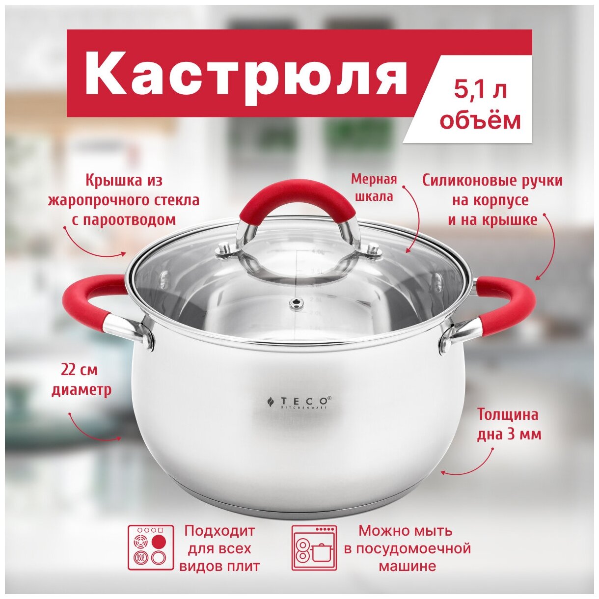 Лучшие цены. Название Кастрюля Teco из нержавеющей стали 22 cm-5,1л. Категория Кастрюли и ковши. материалсталь, для индукционных плит, особенностимытье в посудомоечной машине, ненагревающаяся ручка, крышка в комплекте, толщина стенок0.50 мм, толщина дна3 мм. Тип кастрюля. Материал сталь. Совместимость с индукционными плитами есть. Особенности мытье в посудомоечной машине, ненагревающаяся ручка, крышка в комплекте. Толщина дна 3 мм. Толщина стенок 0.5 мм. Магазины в вашем городе.