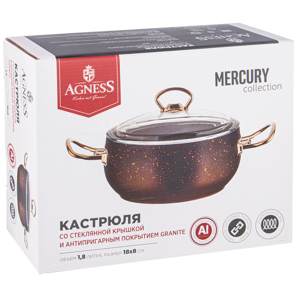 Лучшие цены. Марка AGNESS представляет посуду турецкого производителя серии Mercury. Серия Mercury - это идеальное сочетание традиций и современных технологий. Необычная округлая форма и утолщенные стенки позволяют сохранить тепло внутри посуды и создают эффект томления. Это наилучший способ готовить полезные и вкусные блюда, максимально сохраняя всю пользу и оттенки вкуса. Посуда выполнена из кованного алюминия. Благодаря этой технологии посуда становится более прочной, износостойкой и не подвержена деформации. Магазины в вашем городе.