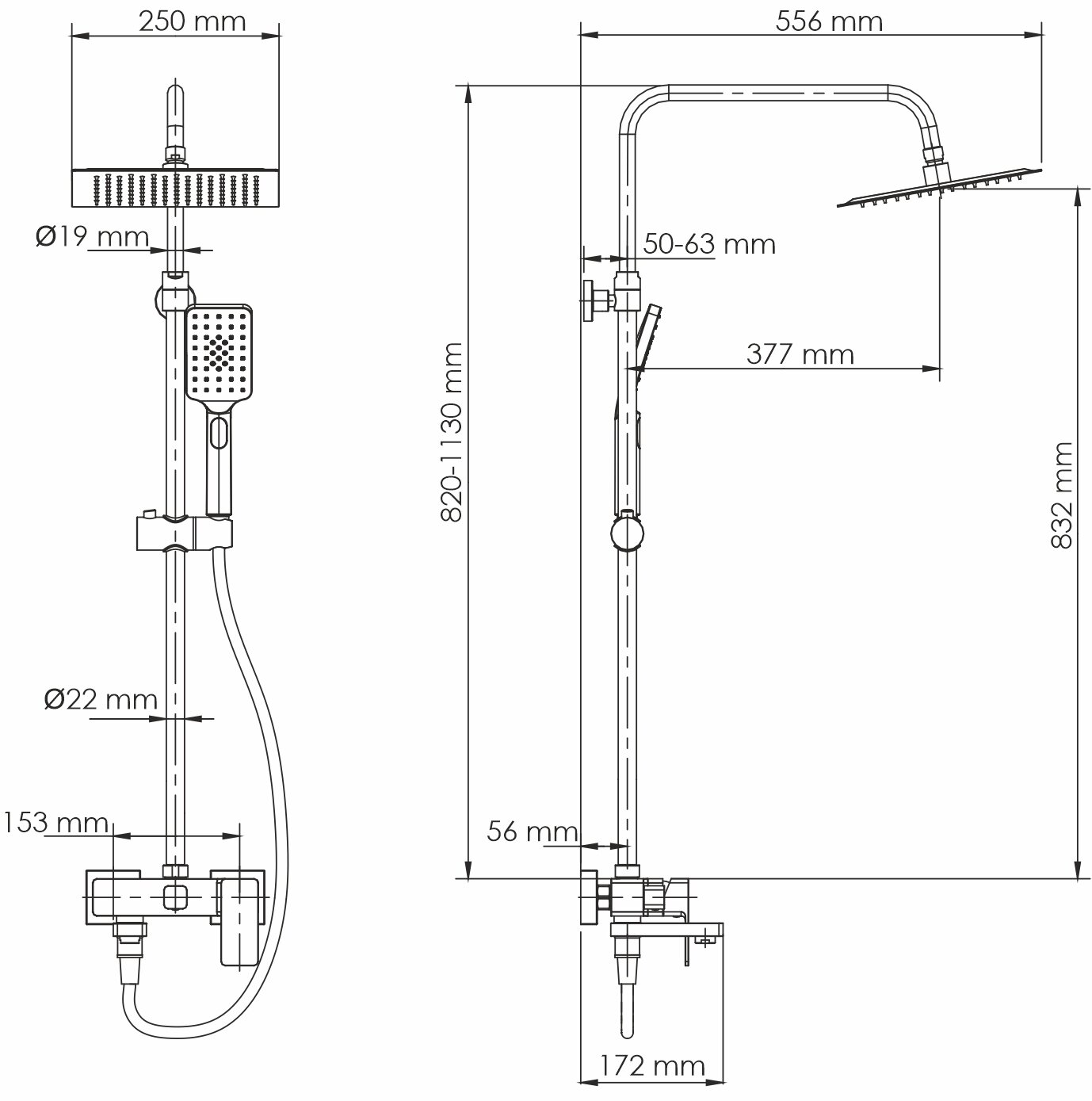 | Комплектация | ручной душ (душевая лейка) / верхний душ (тропический) / стойка / штанга / душевой шланг / крепление ручного душа |