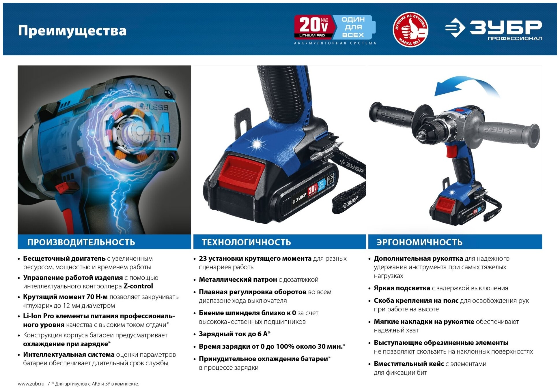 ЗУБР Т7, 20 В, 70 Н·м, без АКБ, бесщеточная дрель-шуруповерт, Профессионал (DB-201)