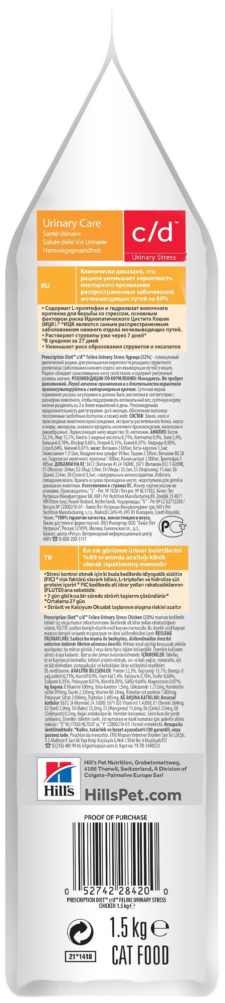 HILL'S PRESCRIPTION DIET MULTICARE STRESS С/D CHICKEN для взрослых кошек при мочекаменной болезни, цистите и стрессе (1,5 кг)