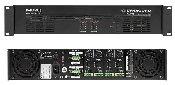 Усилитель Dynacord PCL 1415 усилитель мощности, 4 канала, 150 Вт @ 4 Ом, 75 Вт @ 8 Ом, 2RU