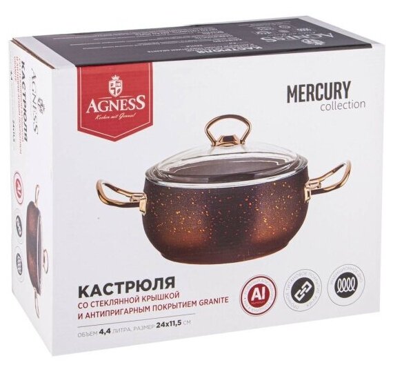 Лучшие цены. Кастрюля с антипригар. покрытием granite, серия mercury, 24х11,5см, 4,4л, pfoa free Agness (953-004) Марка AGNESS представляет посуду турецкого производителя серии Mercury. Серия Mercury - это идеальное сочетание традиций и современных технологий. Необычная округлая форма и утолщенные стенки позволяют сохранить тепло внутри посуды и создают эффект томления. Это наилучший способ готовить полезные и вкусные блюда, максимально сохраняя всю пользу и оттенки вкуса. Посуда выполнена из кованного алюминия. Магазины в вашем городе.