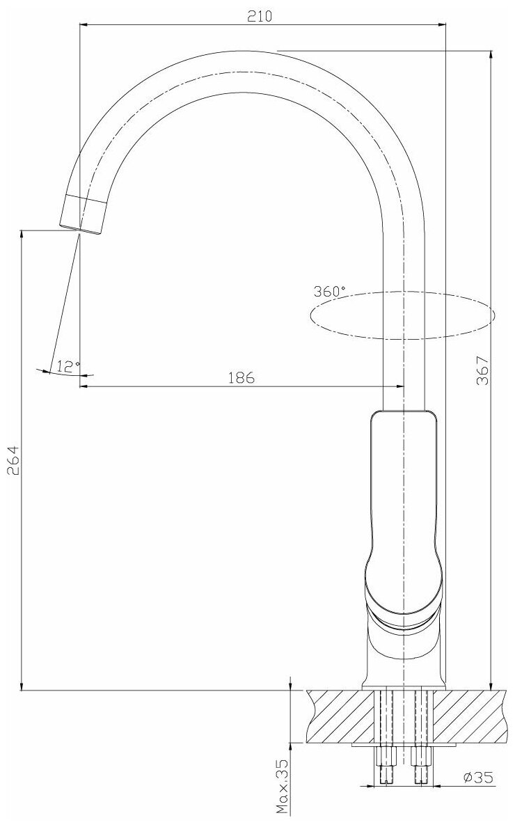 Смеситель однозахватный (35 мм) для кухни, с высоким поворотным изливом, RS27-23
