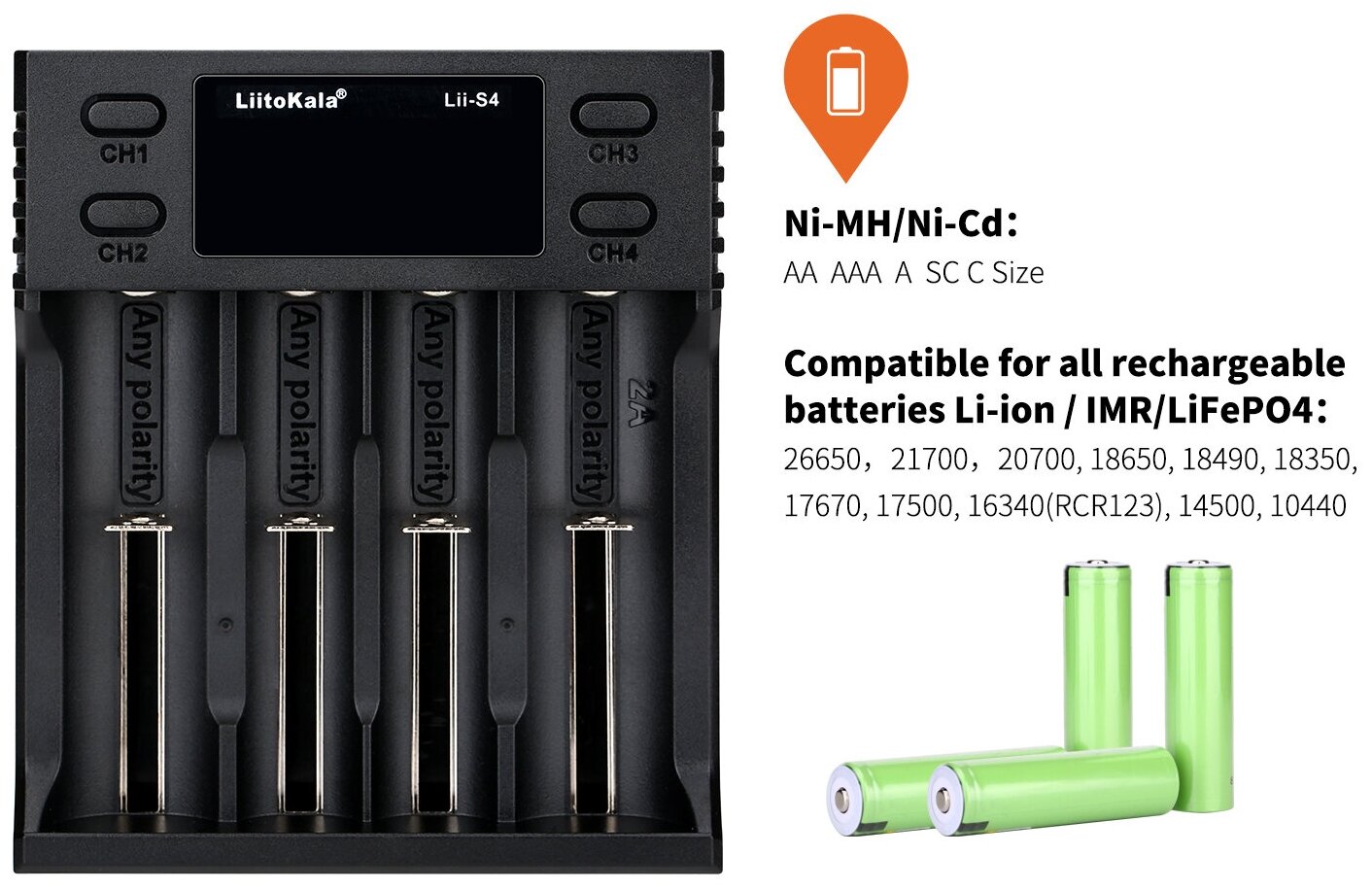 Зарядное устройство LiitoKala Lii-S4 для Li-ion, Li-FePO4, Ni-Mh и Ni-Cd аккумуляторов (14500, 16340, 18500, 18650, 26650, 20700, AA, AAA) , 1шт.