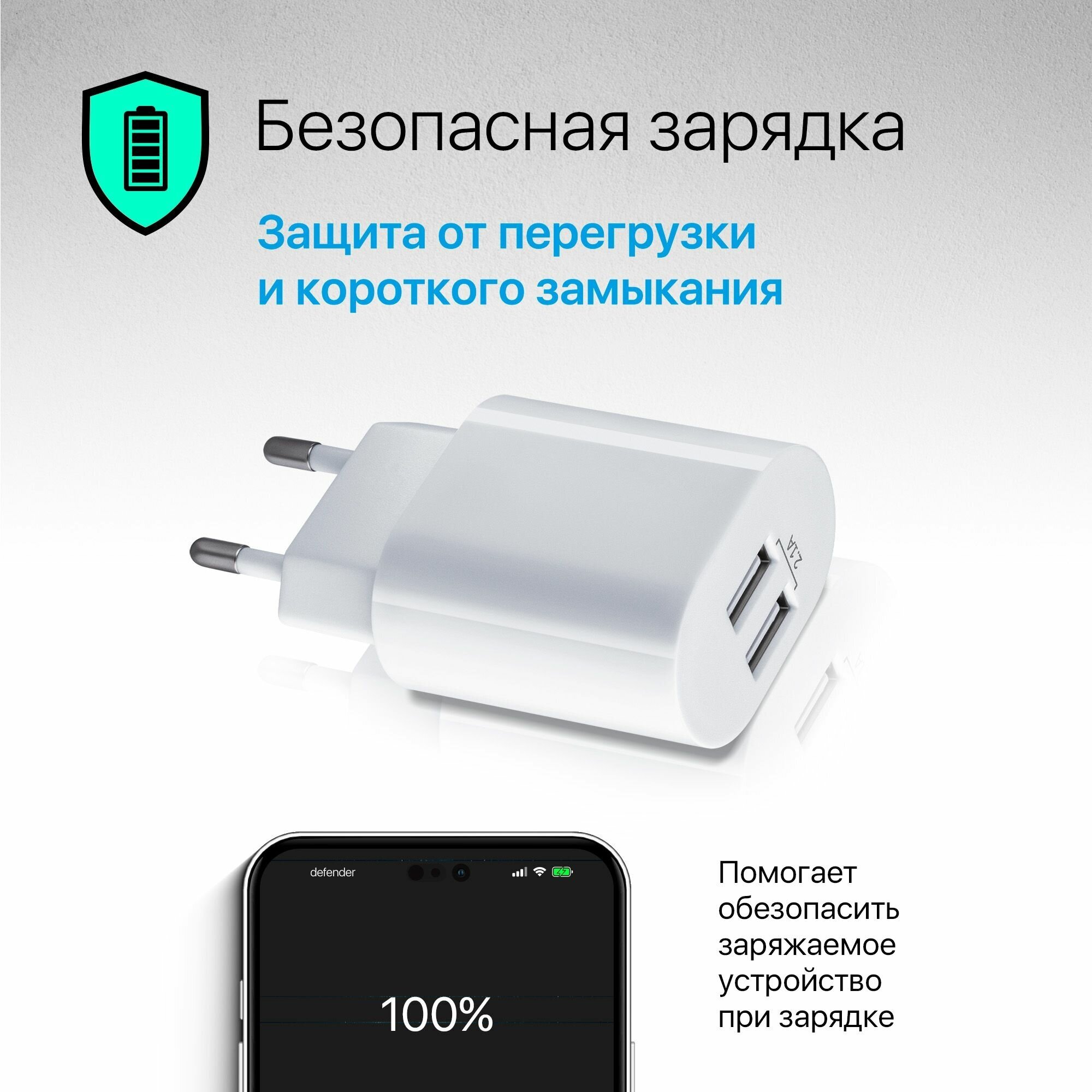 Defender Сетевое зарядное устройство Defender EPA-13, 2 USB, 2.1 А, белое