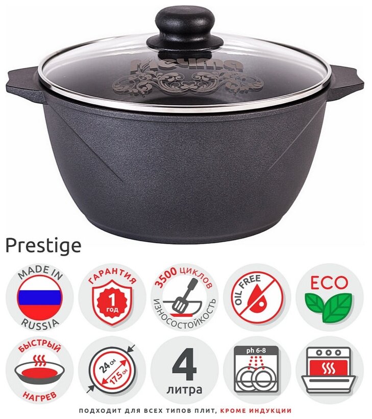 Лучшие цены. Преимуществом кастрюли Престиж с антипригарным покрытием является то, что во время варки к её дну не прилипают крахмальные и мучные изделия: макароны, пельмени, вареники. Достаточно мягкой губки с мыльной водой, чтобы кастрюля снова была готова к использованию. Серия Престиж — это литая алюминиевая посуда с двухслойным антипригарным покрытием нового поколения, усиленная керамическими частицами. Покрытие кастрюли Престиж произведено немецкой компанией «Weilburger Coatings GmbH» (ТМ Greblon). Магазины в вашем городе.